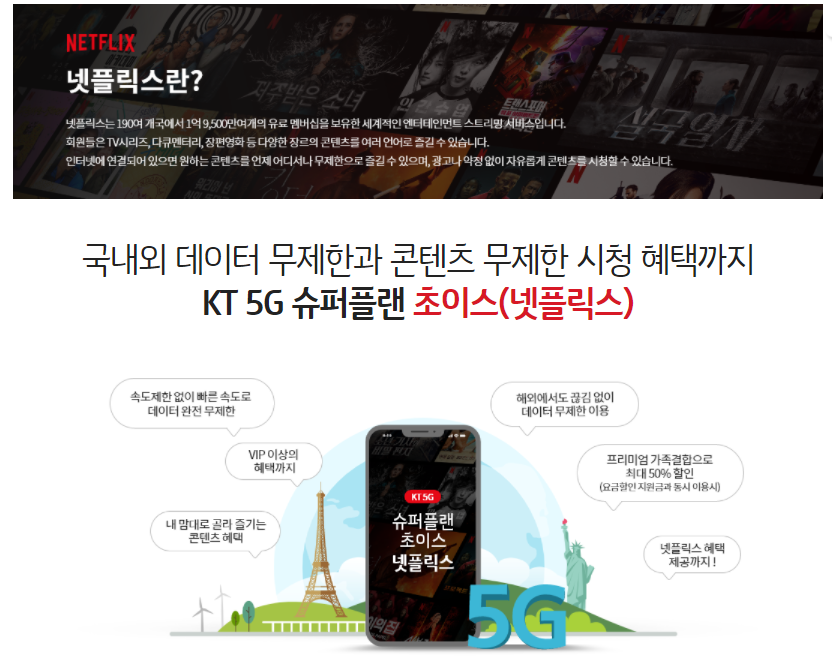 또 KT 5G 요금제만의 장점이 있는데요. 요즘 집콕 필수가 되어버린 넷플릭스와 KT가 제휴를 맺어 요금제 자체에 KT 5G 슈퍼플랜 초이스(넷플릭스)라는 요금제가 생겼습니다. 기존에 슈퍼플랜 요금제에 넷플릭스가 더해졌는데요. 일반 요금제에 넷플릭스만 가입해서 사용하는 것보다 훨씬 더 많은 혜택이 주어졌다고 합니다.