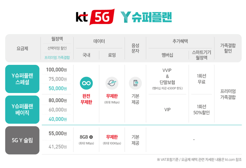 5G의 가장 기본적인 요금제인 KT 5G 슈퍼플랜 인데요. KT는 다른 통신사와는 달리 요금제가 많습니다. LTE 때부터 어린이 요금제, 시니어 요금제, 청소년 요금제, 24세 미만의 성인 요금제 등 다양하게 세분화 시켜놓았는데요. 이번에 5G 요금제 또한 Y슈퍼플랜을 포함해 여러 요금제들이 많습니다.