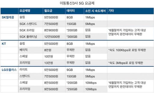 국내 대표 이동통신사 SKT와 KT, LG U+의 5G 요금제를 비교해보겠습니다.